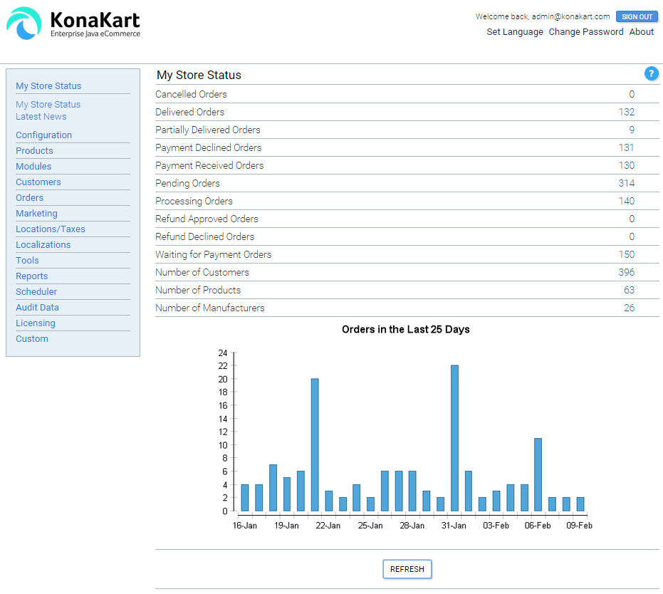 KonaKart includes a sophisticated browser based administration application. It uses AJAX technology to provide a snappy user interface whilst maintaining all of the advantages of running from a browser.